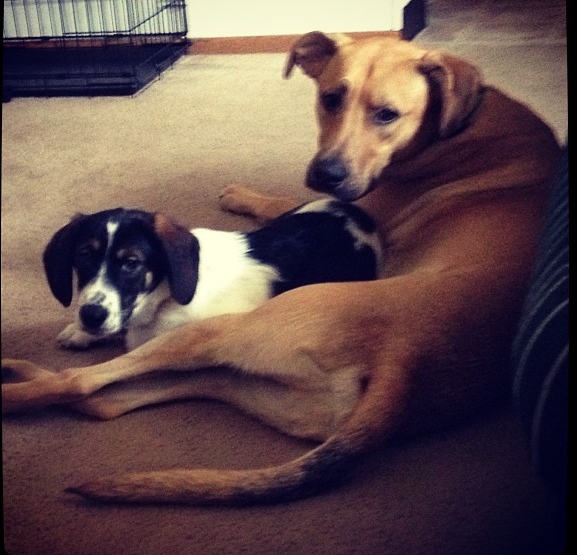 I want you to meet my dogs Oakley and Oscar. Oscar is the white and black Spaniel, Collie, Drever mix and Oakley is a Rhodesian Ridgeback, Shepherd, Great Dane mix. These are amazing dogs. They are low-key and have fun personalities. Oakley in particular loves to play, is very low energy, he rarely barks and best of all, he thinks he is a lap dog. It’s amazing when he’s feeling cuddly on a cold day. Currently, however, he has a pulled muscle. He does not just have a pulled muscle, but it is his right front leg that has the pulled muscle. Dogs get a lot of action on all 4’s, but the front legs seem to be his most important/most used. He cannot do anything without feeling pain right now.